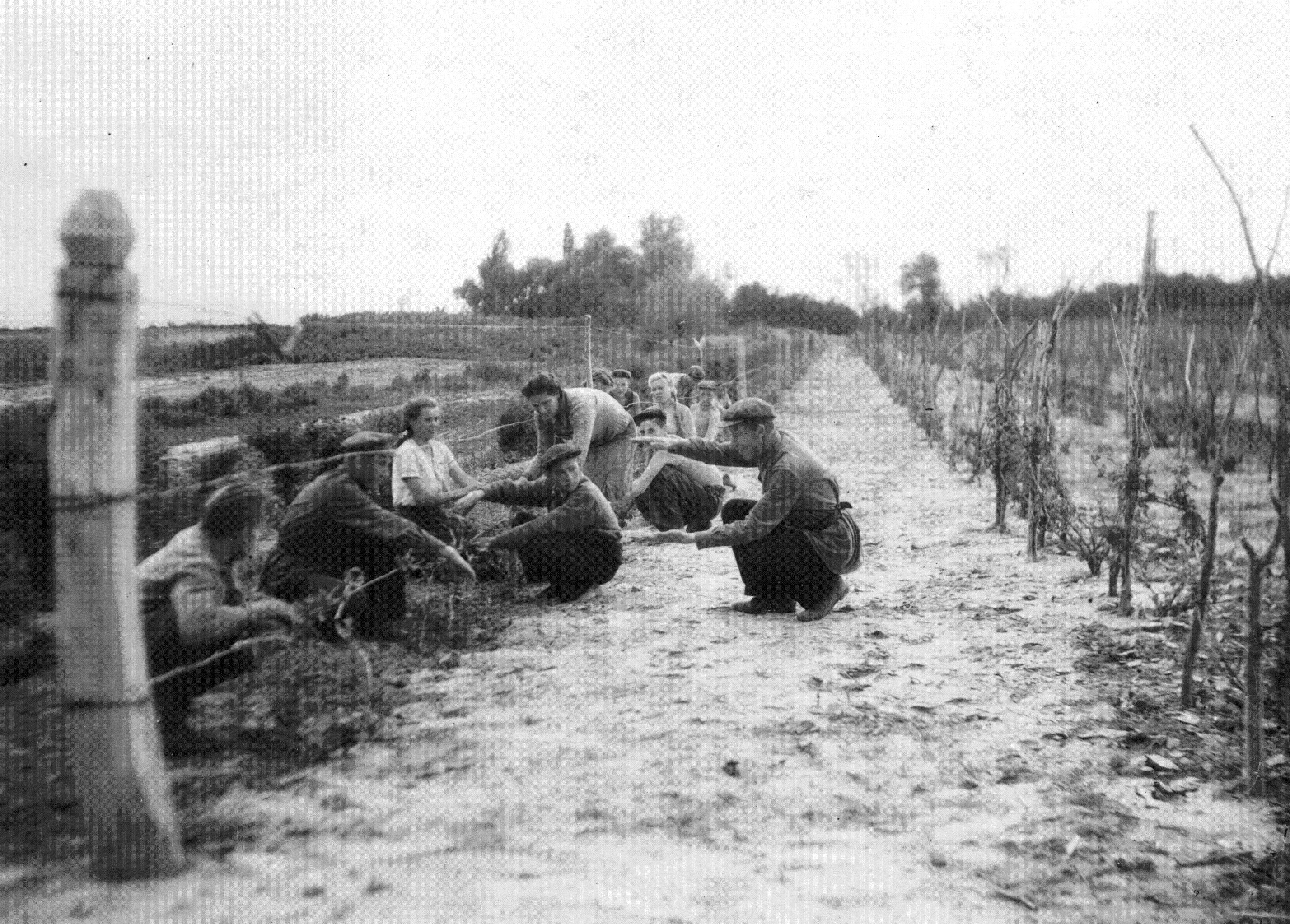 Студенты сельскохозяйственного техникума на разбивке виноградников вблизи Иссыка. 1947 г.